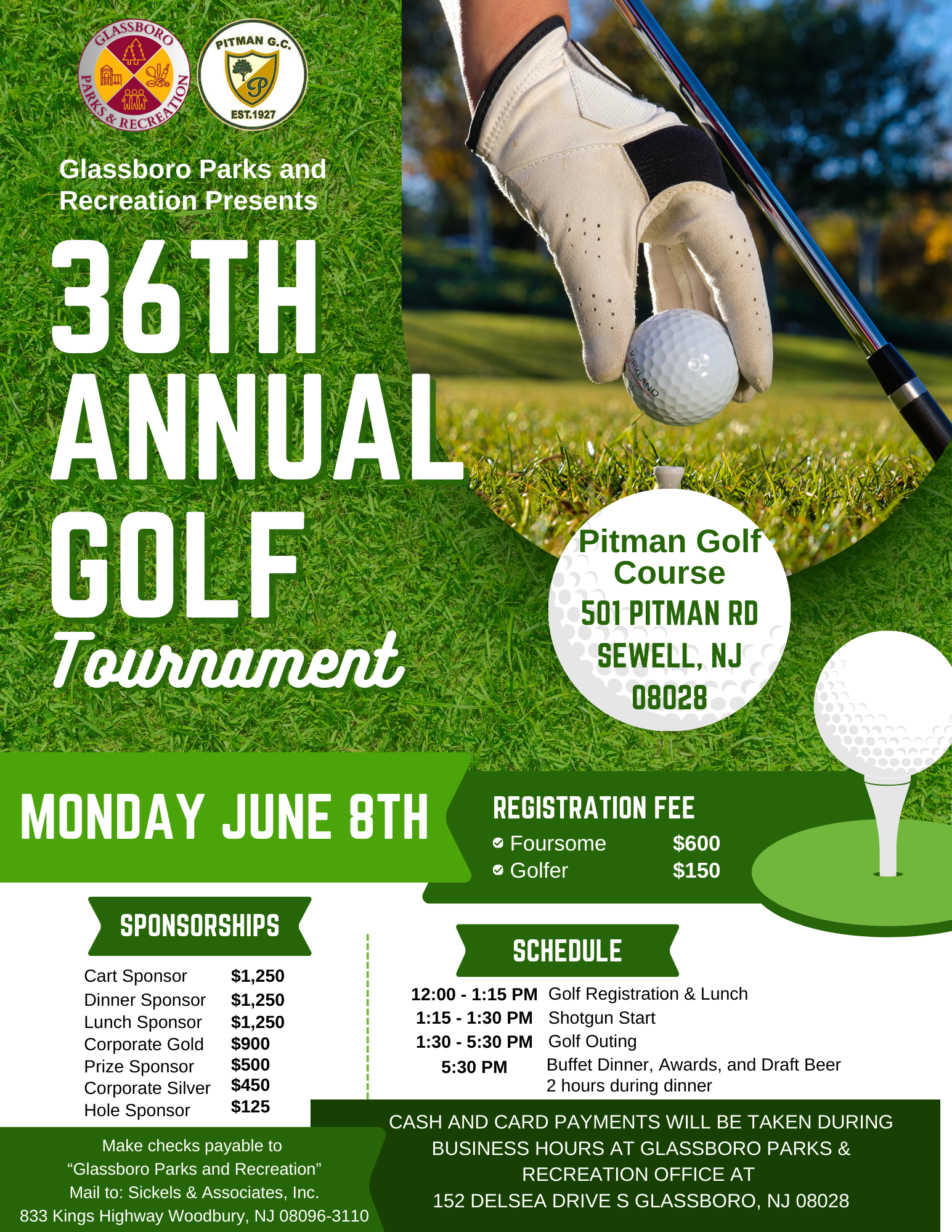 Park & Rec's 35th Annual Golf Outing Monday, June 8, 2026 12:00 PM 3:00 PM Pitman Golf Course 501 Pitman Road Mantua Township, NJ, 08080 United States (map) Google Calendar ICS Click here to Download the Sign Up Form